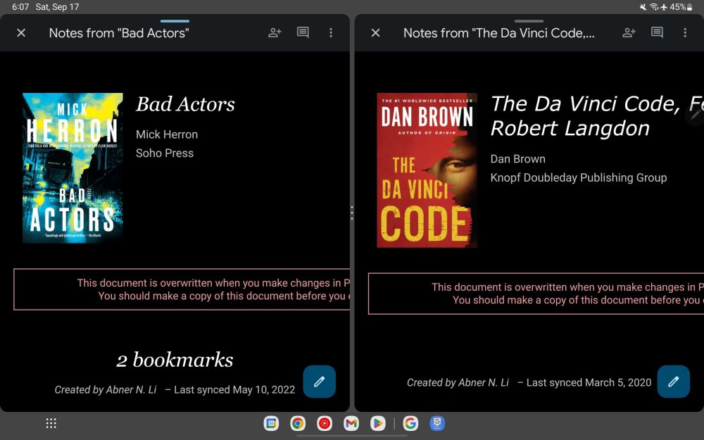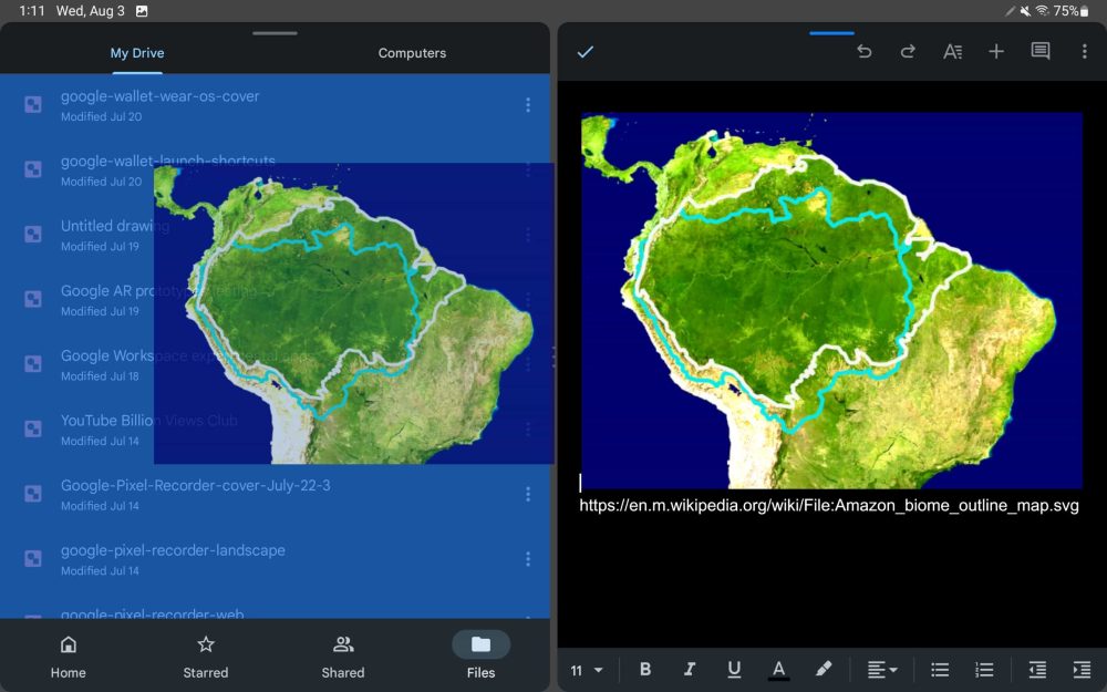 You open the first document and then go back to the Docs/Sheets/Slides app (using the system Recents multitasking menu) to launch the second. Reopen Recents and drag the first file to initiate split-screen. It’s not as easy as Drive’s “Open in new window” button, which has been renamed to “Open in split view” (and only works on folders).