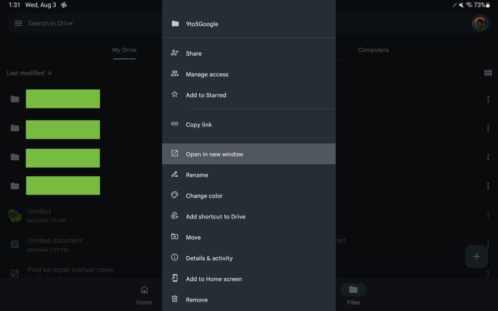 - You can open two Drive instances side-by-side by opening a folder’s overflow menu and selecting “Open in new window.”