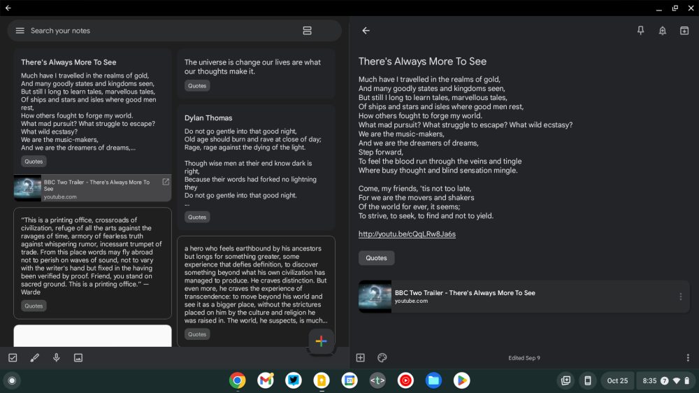 Back in September, Google announced a dual pane layout for Keep that lets you simultaneously see your note list and actual contents. However, this side-by-side view requires a rather higher screen dp and we’ve only encountered it on a Chromebook so far. Otherwise, it’s quite nice.