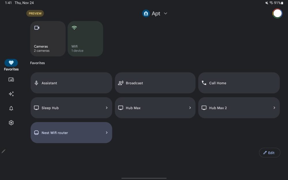 Currently in Public Preview, Google Home starts with a Material You navigation rail that makes use of pill-shaped indicators. You only see the text label of the current tab. In Favorites and Devices, Google switches to a three column layout for tiles. It’s up from two on the phone app, but a fourth would probably look fine, with such a view used by the Edit/Add favorites view.