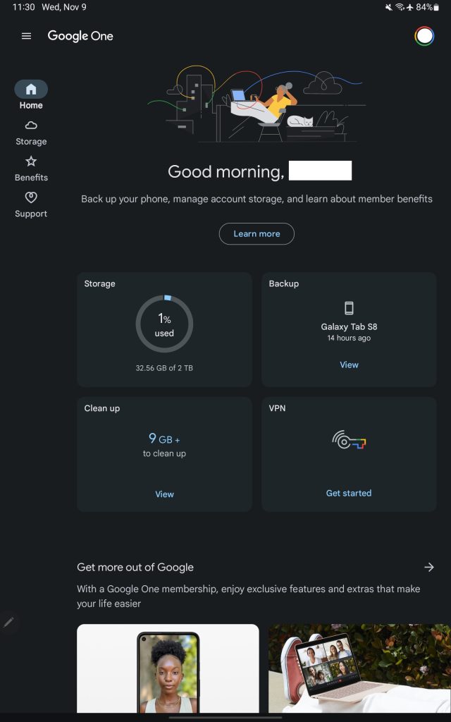 Meanwhile, the Home feed features a new grid of cards for available Storage, Backup status, the Cleanup Tool, and VPN state. The tablet app now matches the Google One website.