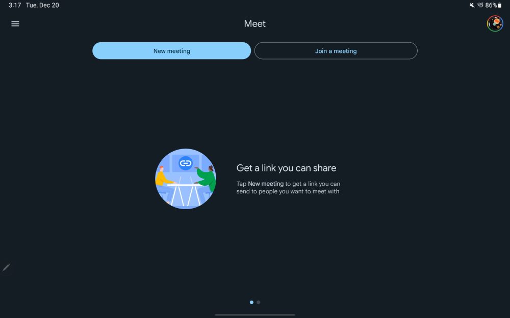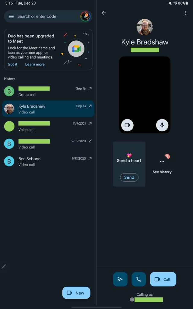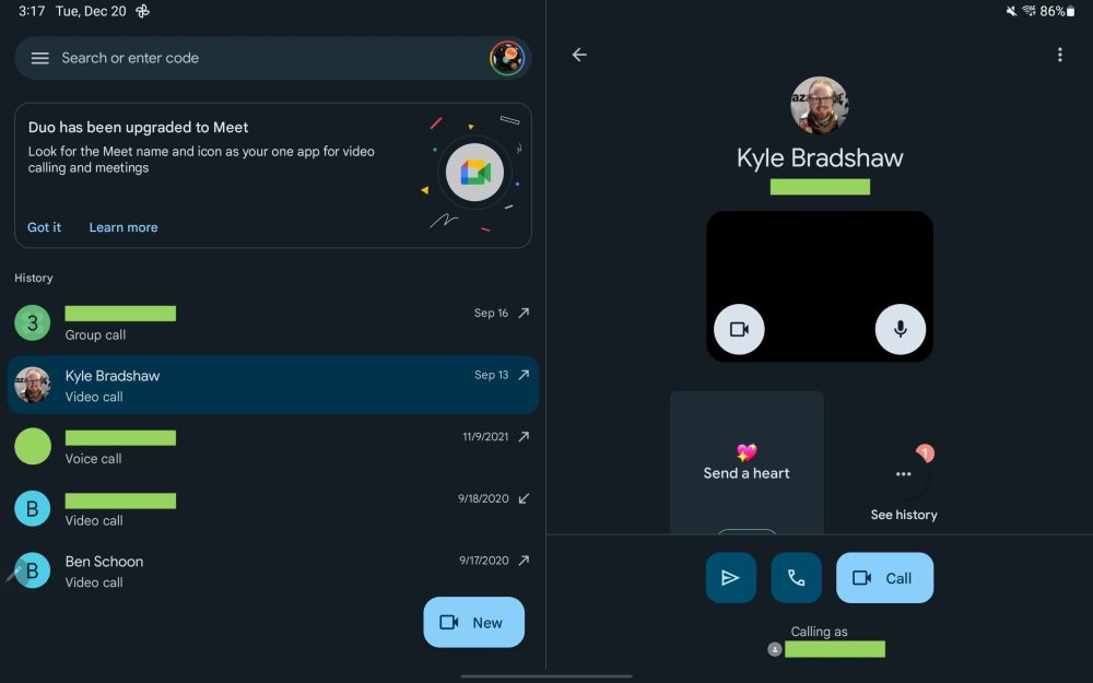 Update 12/21/22: Google Meet has a two-column UI in both portrait and landscape orientations. The homescreen shows your call history, as well as upcoming meetings, on the left. Tapping loads the contact details page on the right for a nice info-dense interface. This dual-column layout is also found in the Meet tab of the Gmail app.