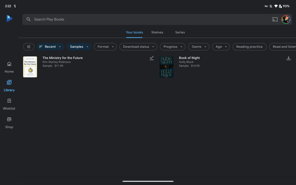 Google Play Books adds a navigation rail as we wait for Material You tweaks — amusingly, the app has had a M3 widget since March of 2022 — and you got the (new) app logo in the top-left corner. A search bar appears at the top along with top tabs (in Library) and a carousel of filters.