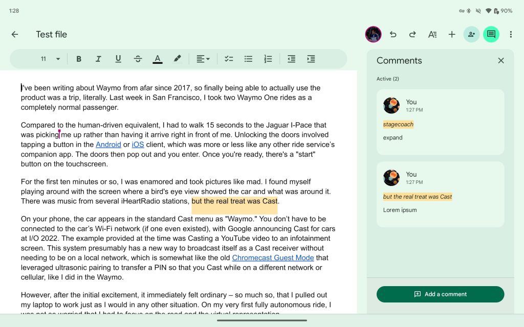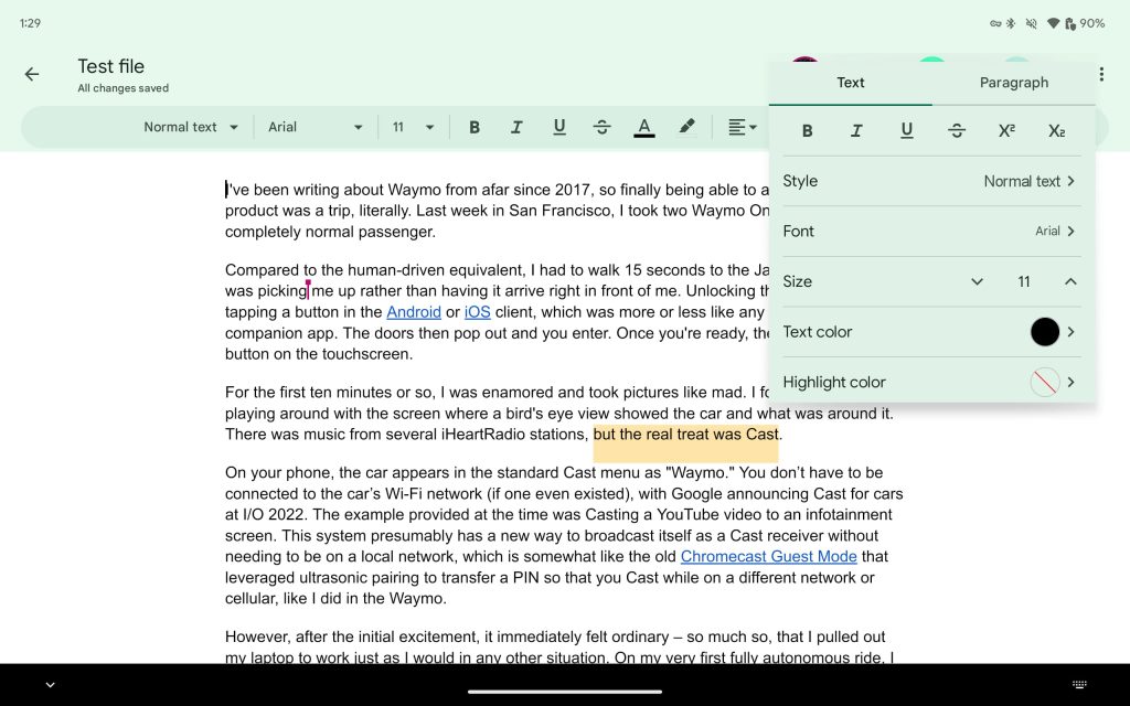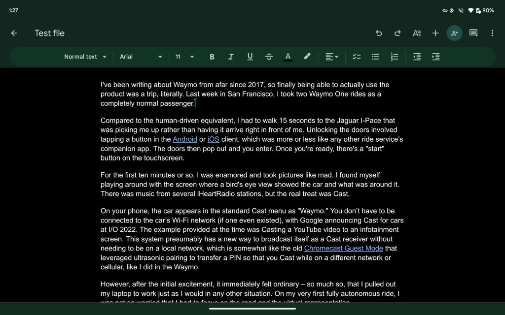 Update 9/10/23: Google Workspace’s editor apps on Android now look like their web counterparts. Instead of a solid app bar, there’s a pill-shaped Material 3 toolbar for font and formatting.
