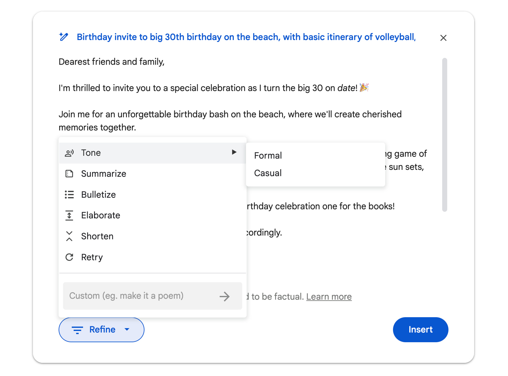 Help me write, powered by Gemini models, is also available in Google Docs on the web where you get additional “Bulletize,” “Summarize,” and “Tone” (“Formal” or “Casual”) refinements. You can also write a “Custom” prompt, like “make it a poem.