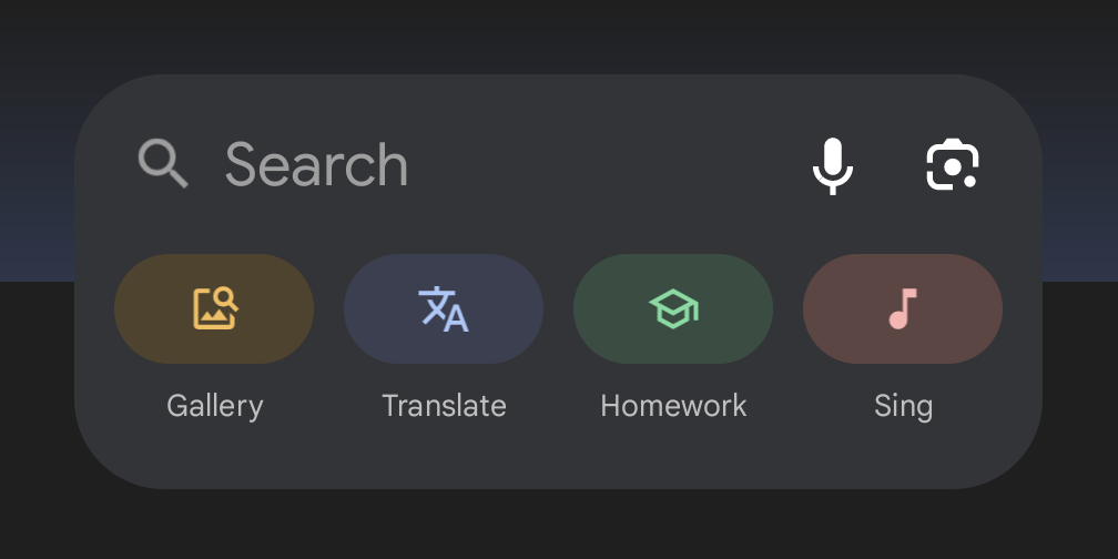 Showing up now in the latest beta versions of the Google app on Android, a tweak to the search bar shows four buttons underneath the search bar by default. These default to Gallery, Translate, Homework, and Sing.