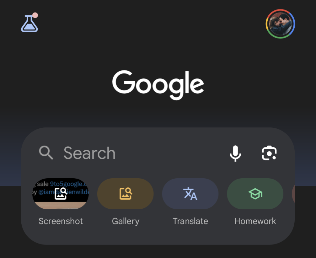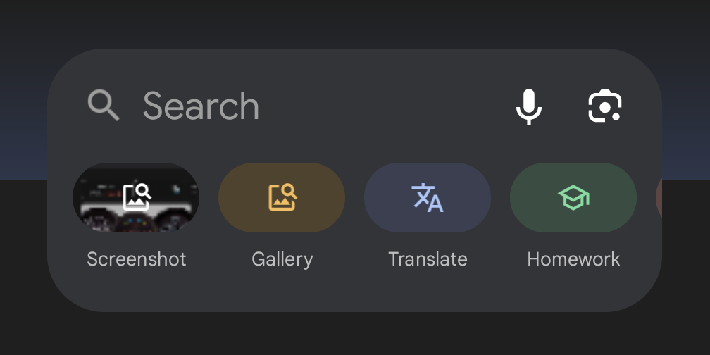 Showing up now in the latest beta versions of the Google app on Android, a tweak to the search bar shows four buttons underneath the search bar by default. These default to Gallery, Translate, Homework, and Sing.