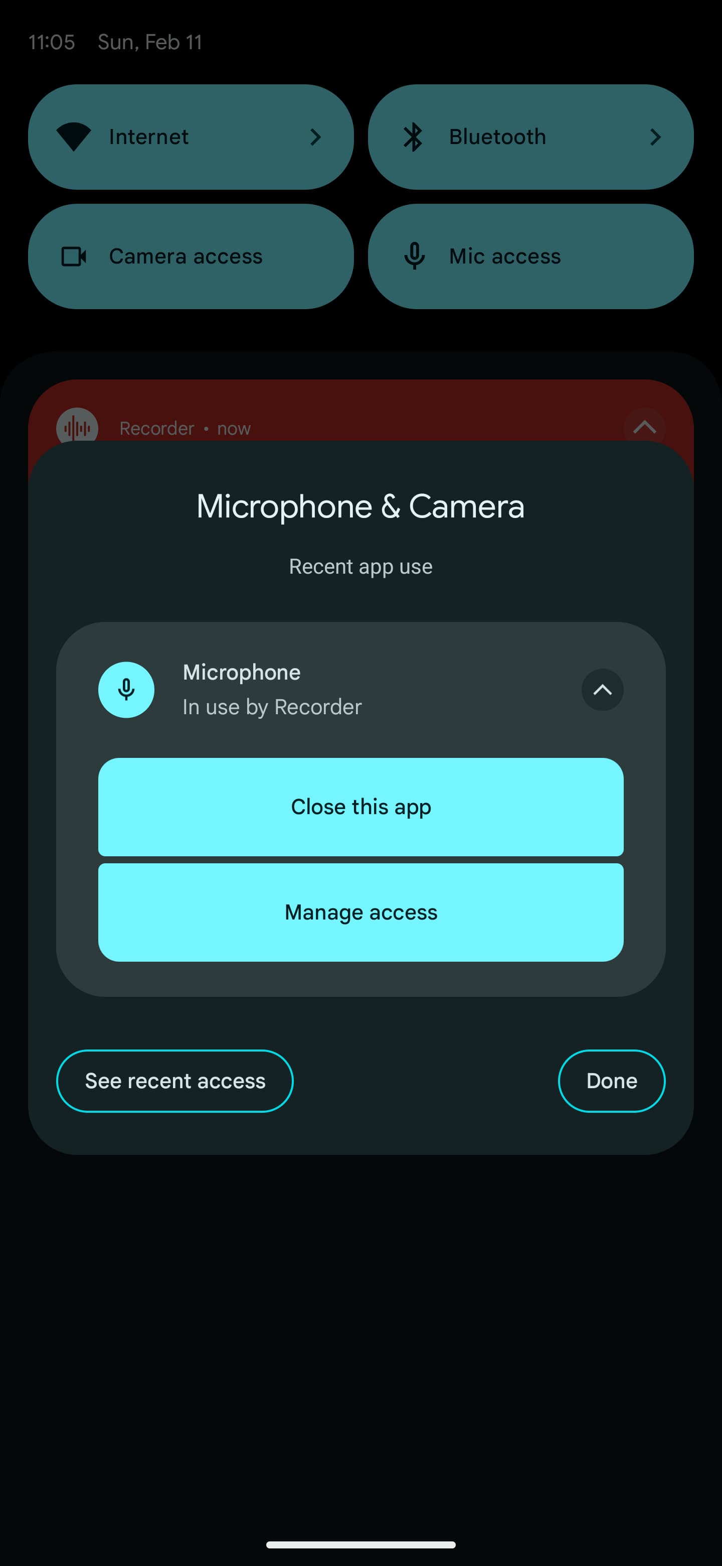 Google has also updated the Microphone and Camera privacy indicators with a “Close this app” shortcut. To access, open Quick Settings and tap the green pill in the top-right corner.