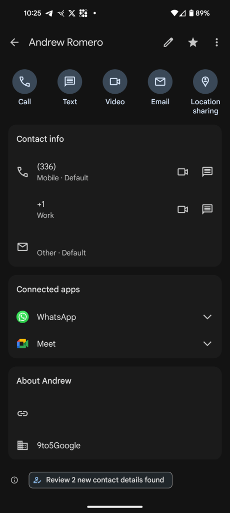With this version, Contacts shows a new section for “Connected apps” underneath the main contact information. This works with apps on your phone that you’ve used with the contact’s information in those other apps and allows for messages as well as voice and video calls. WhatsApp and Telegram are good examples of this, but it also works with Google Meet and other apps too.