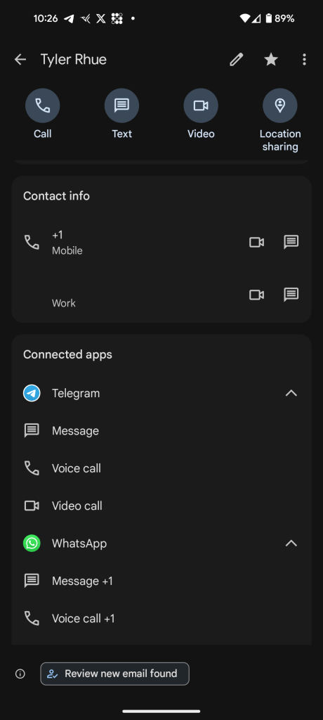 With this version, Contacts shows a new section for “Connected apps” underneath the main contact information. This works with apps on your phone that you’ve used with the contact’s information in those other apps and allows for messages as well as voice and video calls. WhatsApp and Telegram are good examples of this, but it also works with Google Meet and other apps too.