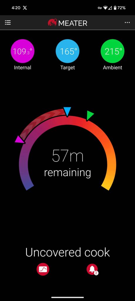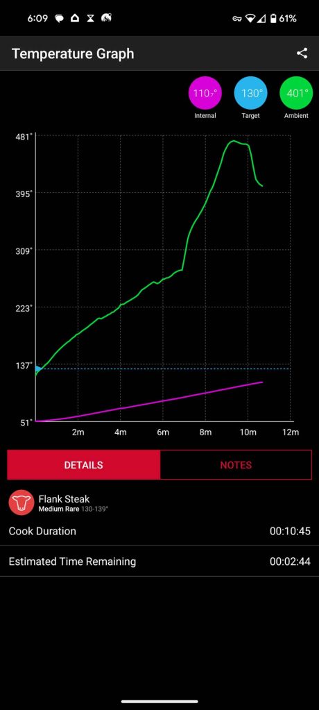 The Meater Android app showed exactly what I wanted to see during the test cook. The rise in temperature was normal and well within the parameters I’m used to for this type of cook. By all accounts, the Meater 2 Plus was working as it was supposed to.