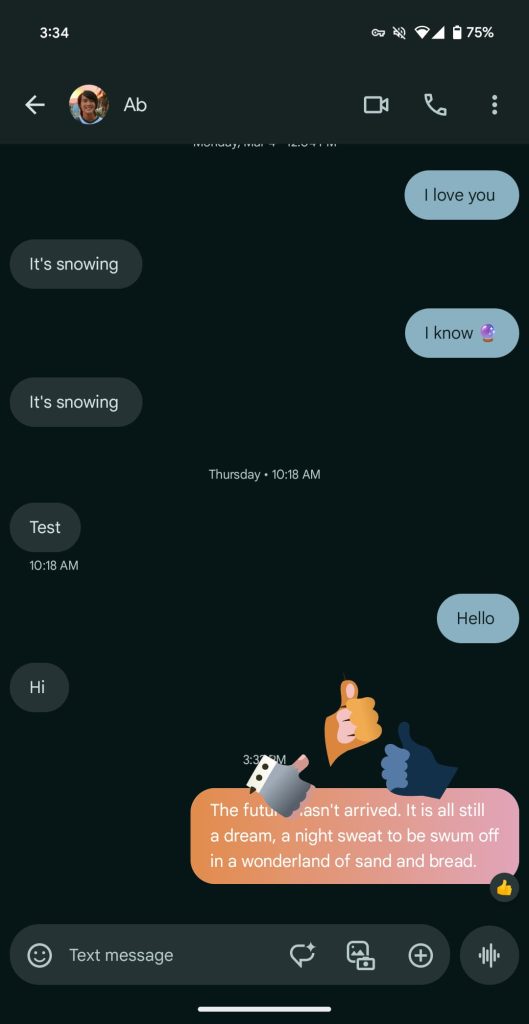 When you long-press on a message — SMS or RCS — and select thumbs up, “magic instantly unfolds as an animated trio of hands dances around the message bubble.” Google says this is “designed to add a dynamic twist to your chats.”
