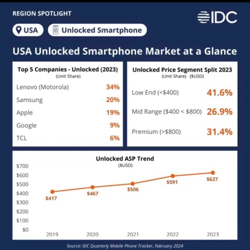 Interestingly, Google seems to be doing especially well in unlocked sales, with 9% of smartphones sold unlocked in the States last year being Pixels. Lenovo took the top slot with Motorola making up 34%, and with Samsung and Apple at 20% and 19% respectively. The unlocked market, IDC says, grew by 1.1% in the US last year.