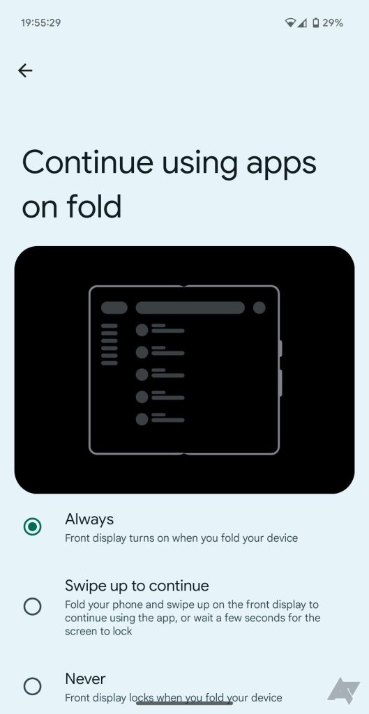 The other is present on the Pixel Fold running Android 15 DP2. Google has added an option to allow apps to continue running on the outer display when the device is closed. This isn’t the default behavior, but a new settings menu allows users to select between “never” opening apps on the outer display – the current behavior –, “always” continuing the app on the outer display, or requiring a swipe up to keep the app running. The new settings were spotted by an Android Police tipster who installed the update.