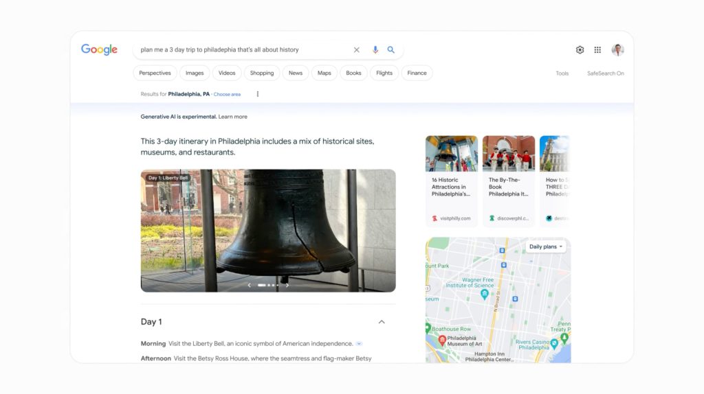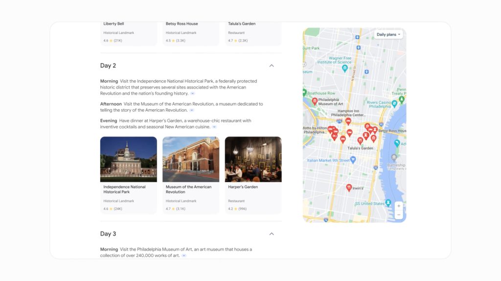 SGE is also testing (US English) trip ideas that should be similar to Gemini/Bard. For example, you can ask “plan me a 3 day trip to Philadelphia that’s all about history.”