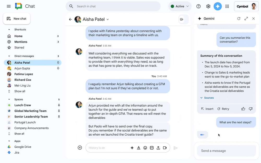 Gemini is coming to Google Chat to summarize conversations and answer questions. On the web, it also appears as a side panel. Chat is also getting automatic message translation later this year, while Google is increasing spaces capacity to 500,000 members.