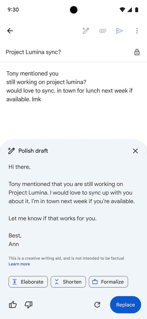 Google is updating Help me write in mobile Gmail with voice prompting and input that lets you “send emails easily when you’re on the go.” Meanwhile, an “instant polish” feature will “convert rough notes to a complete email with one-click.” Google shared today that “70% of enterprise users who use Help Me Write in Docs or Gmail end up using Gemini’s suggestions.”