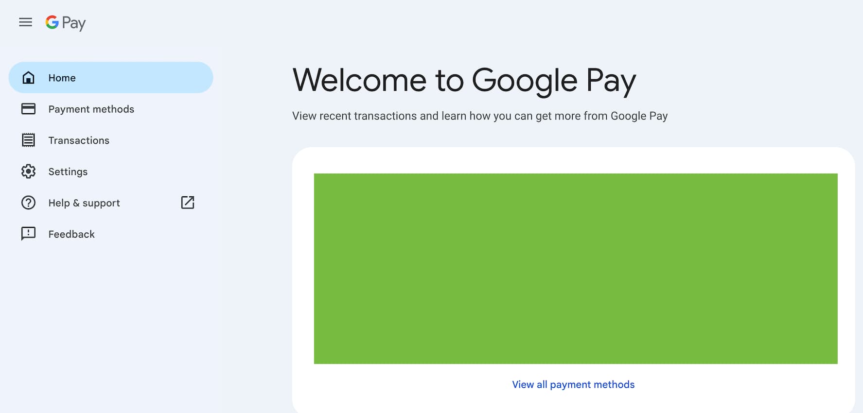 There’s a Home page, Payment methods (credit + debit cards) list, Transactions history, and Settings that link out to various Google preferences (address, data, privacy, etc.) and lets you control email notifications.