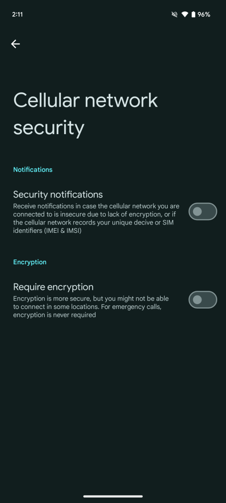 The first toggle, “Security notifications,” is the less strict of the two. Once enabled, Android will let you know whenever you connect to a cellular network that either isn’t encrypted or records your IMEI and IMSI numbers. One common situation in which this would occur is if a law enforcement agency is using a Stingray device to track nearby cell network usage. The ACLU has some helpful resources explaining how and where Stingrays are used in the US.