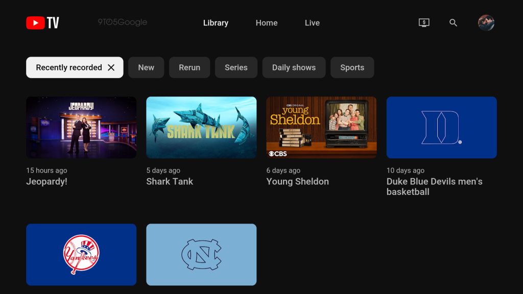 The latest iteration of YouTube TV’s Library tab is based entirely on filters. The page defaults to a “New for you” section which shows recent recordings and content you’ve not yet watched. From there, a “Recently recorded” tab will contain anything recorded within the past week.