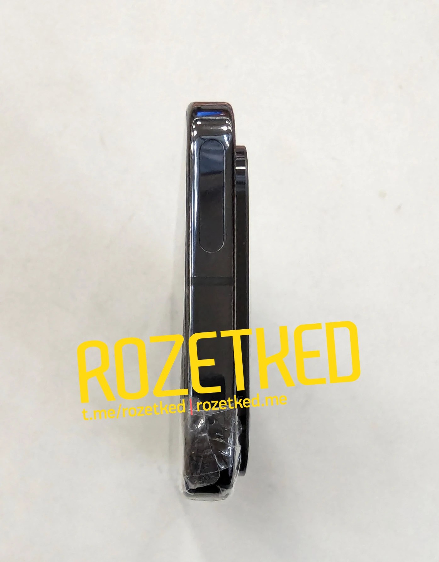 We see the new physical design (next to an 6.7-inch iPhone 14 Pro Max), starting with the new pill-shaped camera bar. There are clearly three lenses on this Pro with flash and a cutout that should once again be for a thermometer.