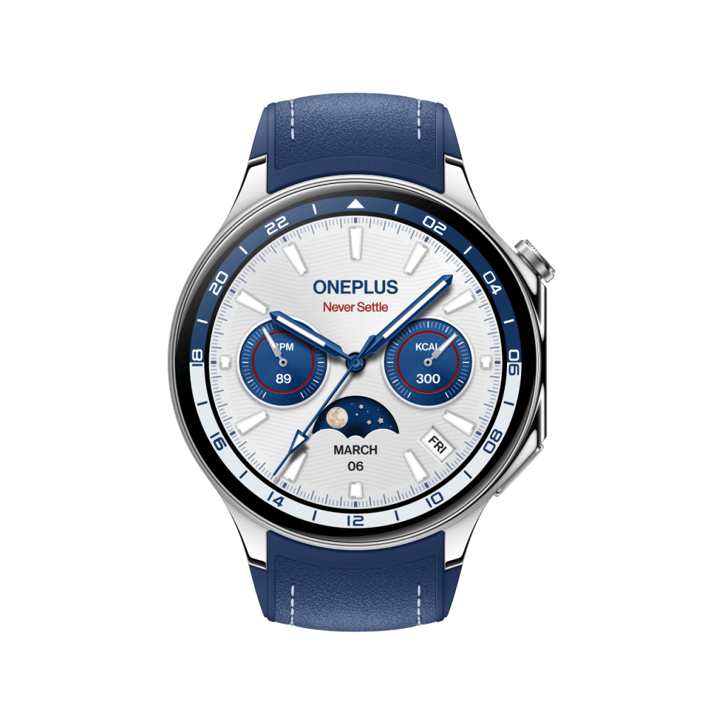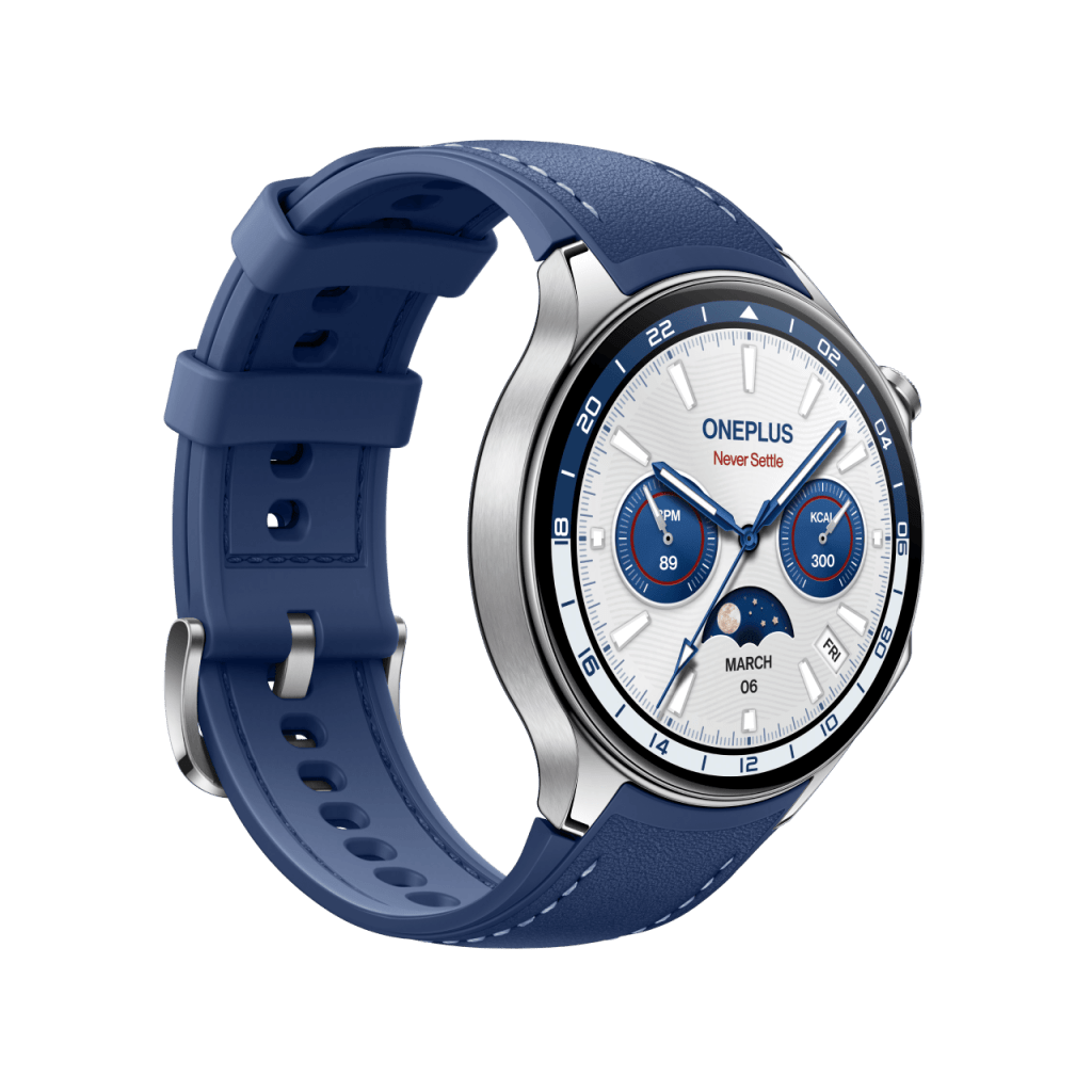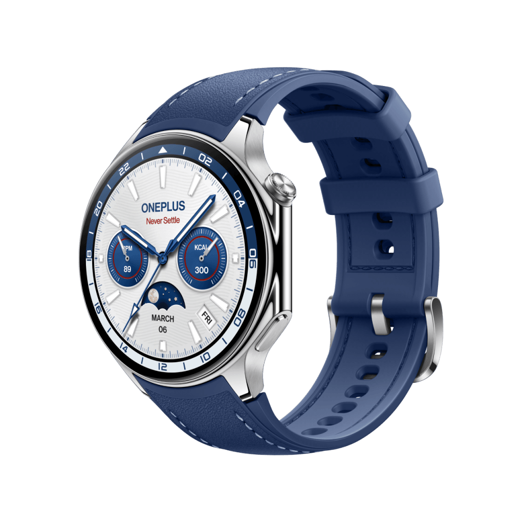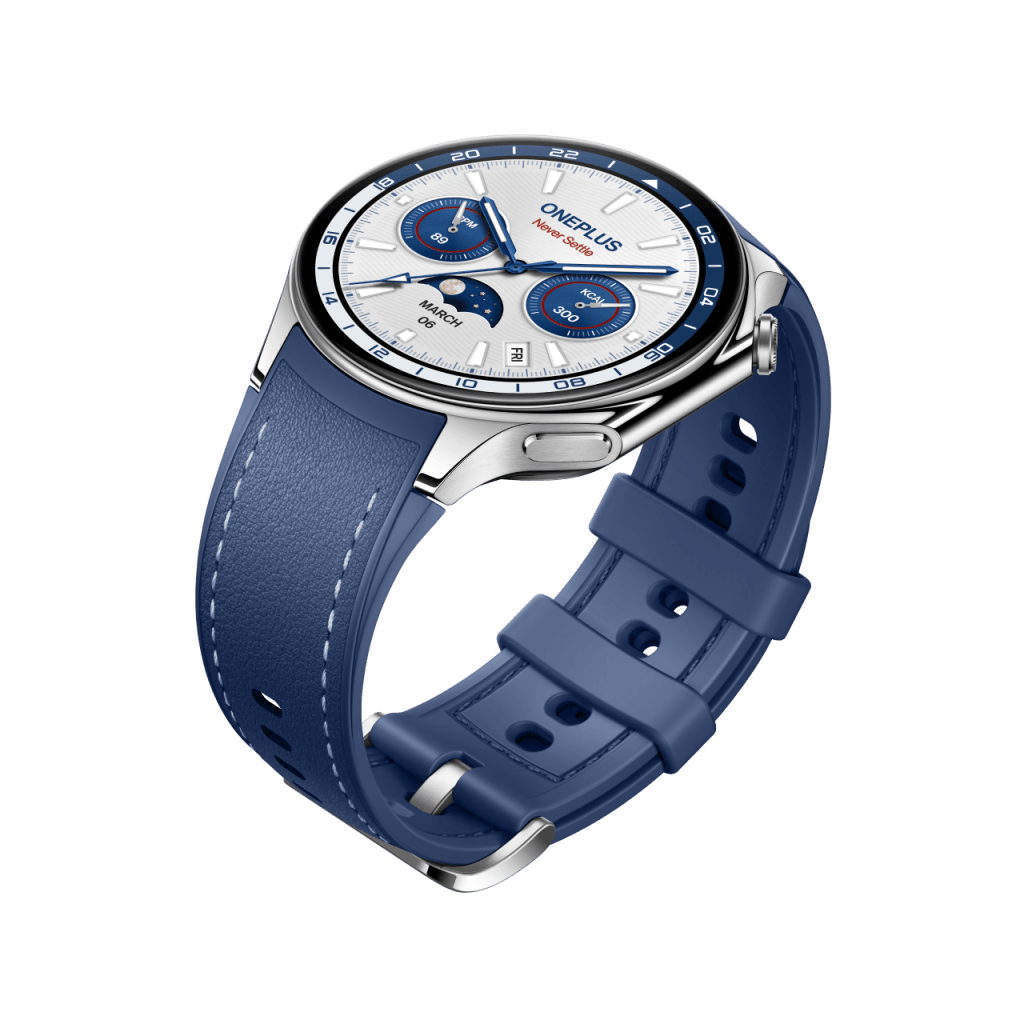 The new color variant went up for sale today in the UK, with OnePlus.com showcasing it right up with the other two colors. This new edition has a blue (possibly faux) leather band with stitching. The inner portion of the band is still silicone. The casing on this new model is still silver, and perhaps a bit more polished compared to the “Radiant Steel,” at least based on OnePlus’ imagery.