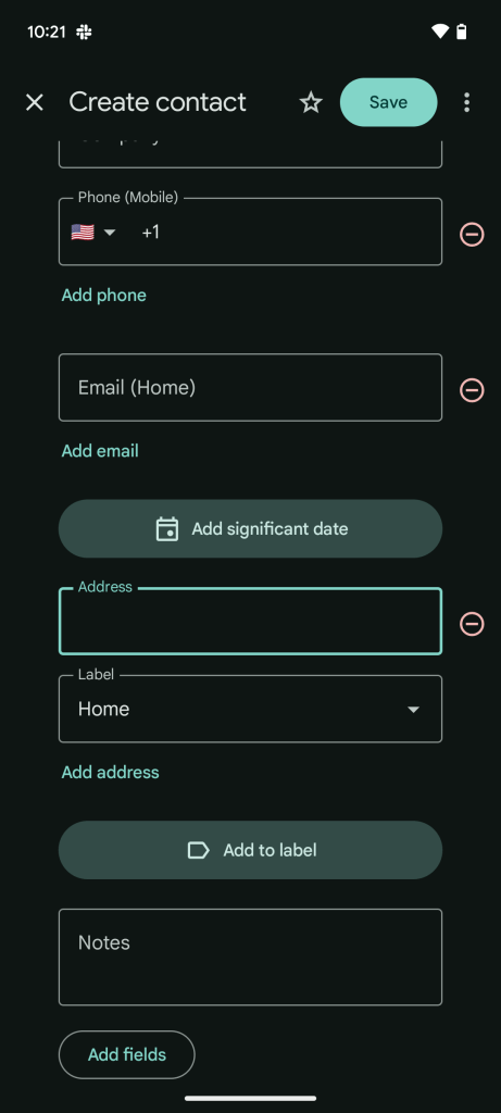 Once that base information is added, you can then add additional phone numbers, an email address, a “significant date” (like a birthday or anniversary), an address, and notes. There’s a further overflow menu for fields such as a middle name, pronunciation, job title, and more.