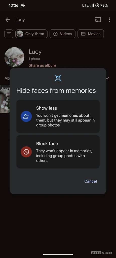 The new option will also give two choices for hiding a face. First is the existing option to hide the face from memories entirely which is called “Block face” in the new menu, while another new option would be to “show less.” This would recognize the person’s face and exclude pictures of them unless it’s a group image. So if other people are in the picture, Google Photos may still show it in a Memory.