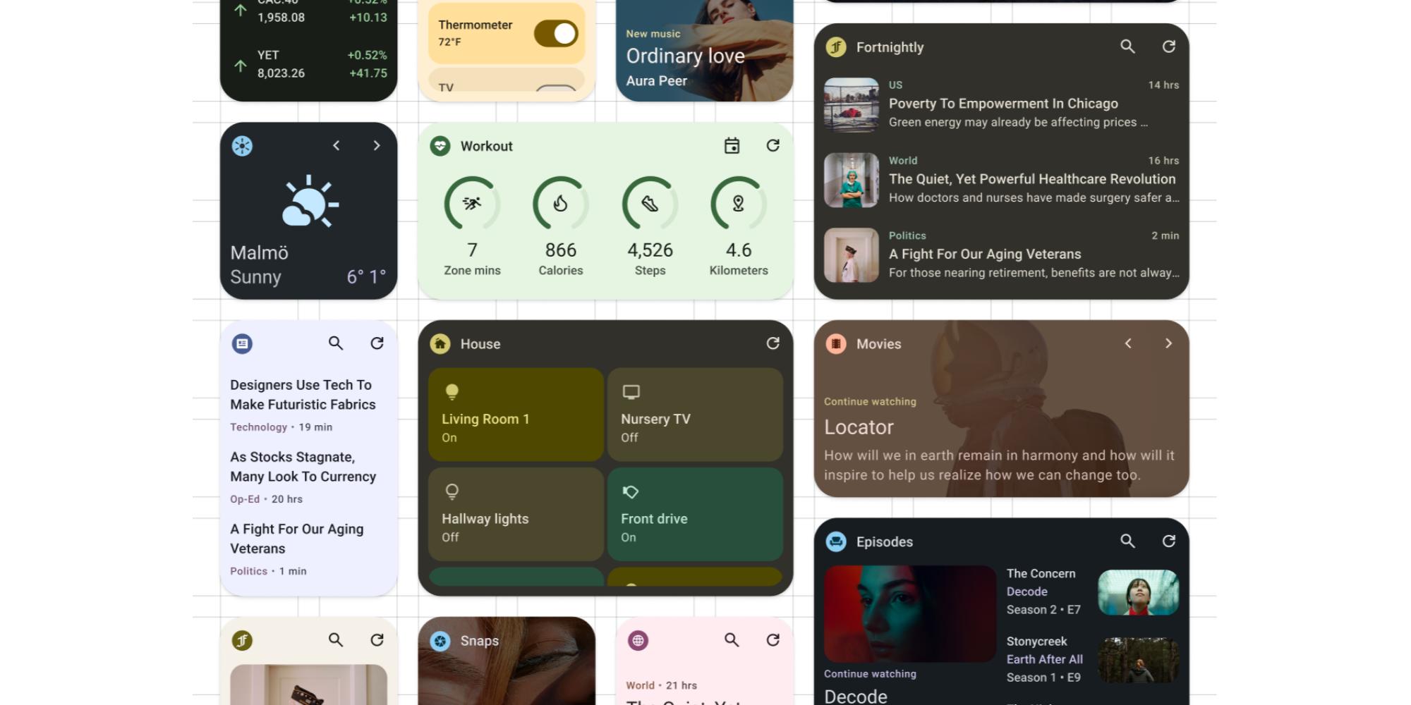 In terms of what’s new, there’s Jetpack-Glance 1.1 and the introduction of “components that take some of the work out of building foundational Ul elements.” Google is offering canonical widget layouts (seen above) that offer pre-built examples for developers to use. Layouts include Text, Lists, Grids, with more coming soon.