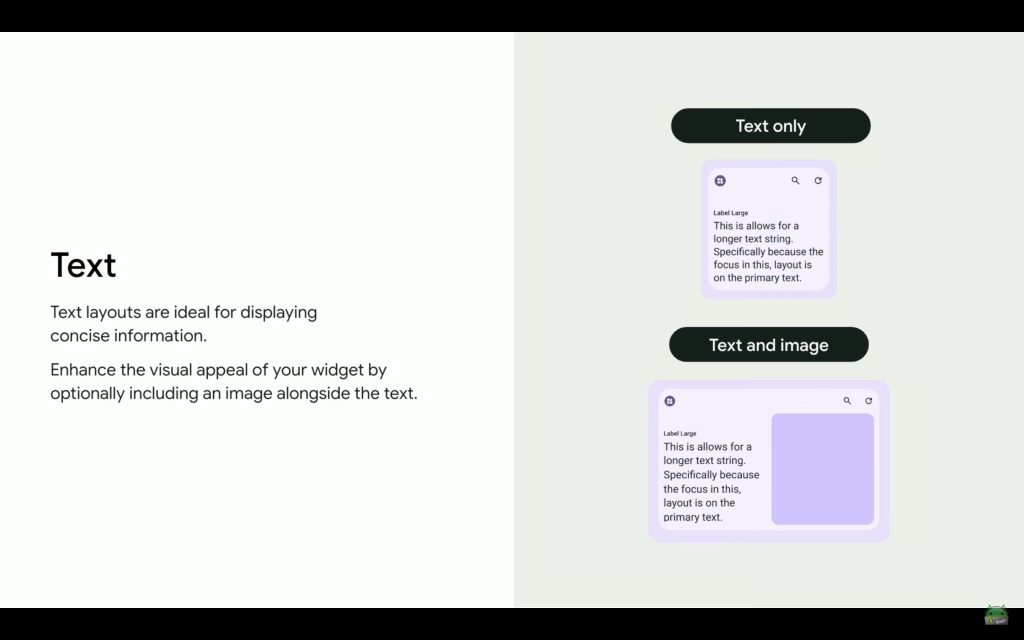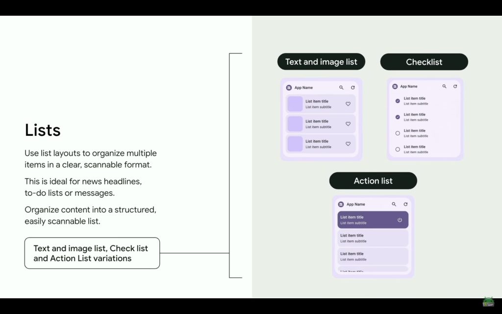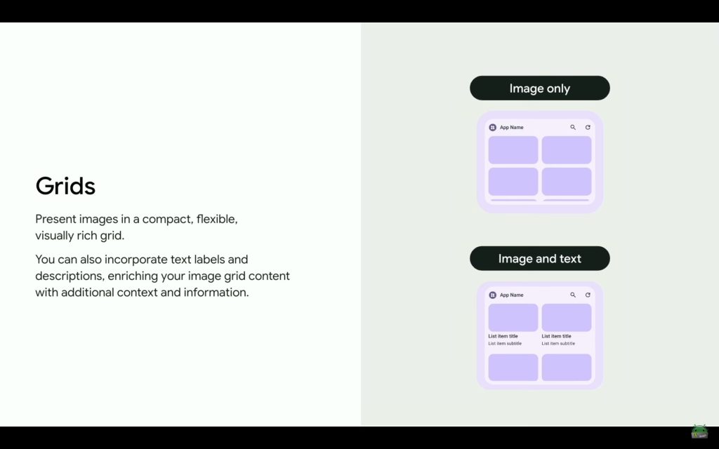 In terms of what’s new, there’s Jetpack-Glance 1.1 and the introduction of “components that take some of the work out of building foundational Ul elements.” Google is offering canonical widget layouts (seen above) that offer pre-built examples for developers to use. Layouts include Text, Lists, Grids, with more coming soon.