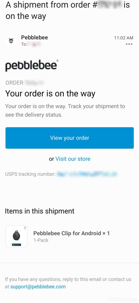 A NewGeekGuide reader sent us a confirmation email of their Pebblebee Clip having shipped. The confirmation email includes a USPS tracking number for the Clip, though the package hasn’t actually started moving through the Postal Service just yet.