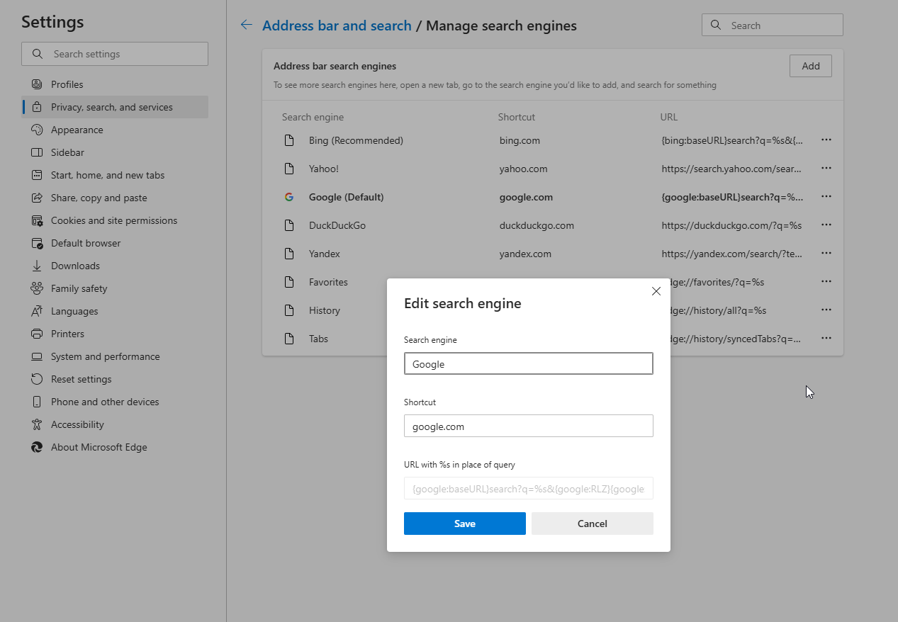 - Microsoft Edge: Settings > Privacy, search, and services > Address bar and search > Manage search engines. Press the edit (three dots) button on Google Search. From there, a new menu will pop up and you can input “{google:baseURL}search?q=%s&udm=14” into the URL field.