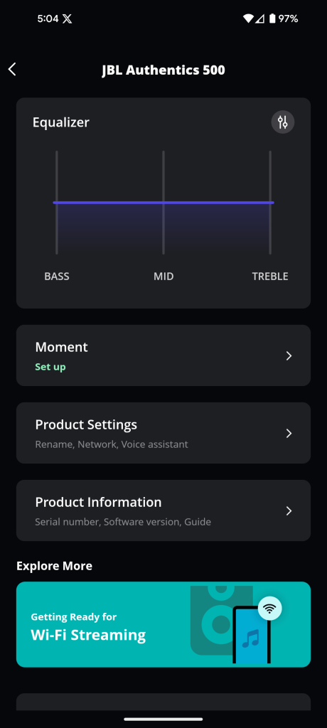 The JBL One app is also a big perk of using the speaker. It’s quick and easy to use. Opening it up you’re quickly presented with easy controls for the EQ, the currently playing music, and other settings. It’s very straightforward and I really liked that, even if I did leave the EQ alone, and mostly used the Google Home app (which mostly only controls volume) instead.