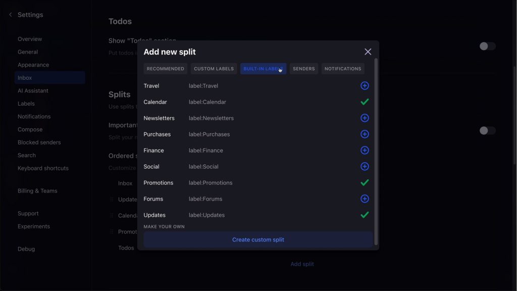 For example, if you were to create a “Newsletters” separation, you can also have one Bundle per newsletter. This means you don’t need to manually create a new Bundle for each specific publication email chain. You can disable bundling for each individual Split if this feature doesn’t work for you and you can create custom Splits that will live as tabs – something not possible in Gmail. You can also hide empty Splits from appearing to help keep clutter out of your inboxes.