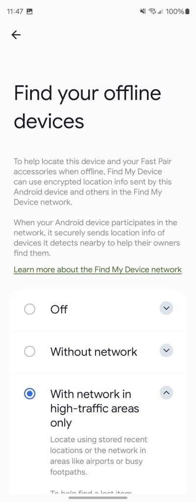 By default, the Find My Device network on Android is set to work in “high-traffic areas” only.