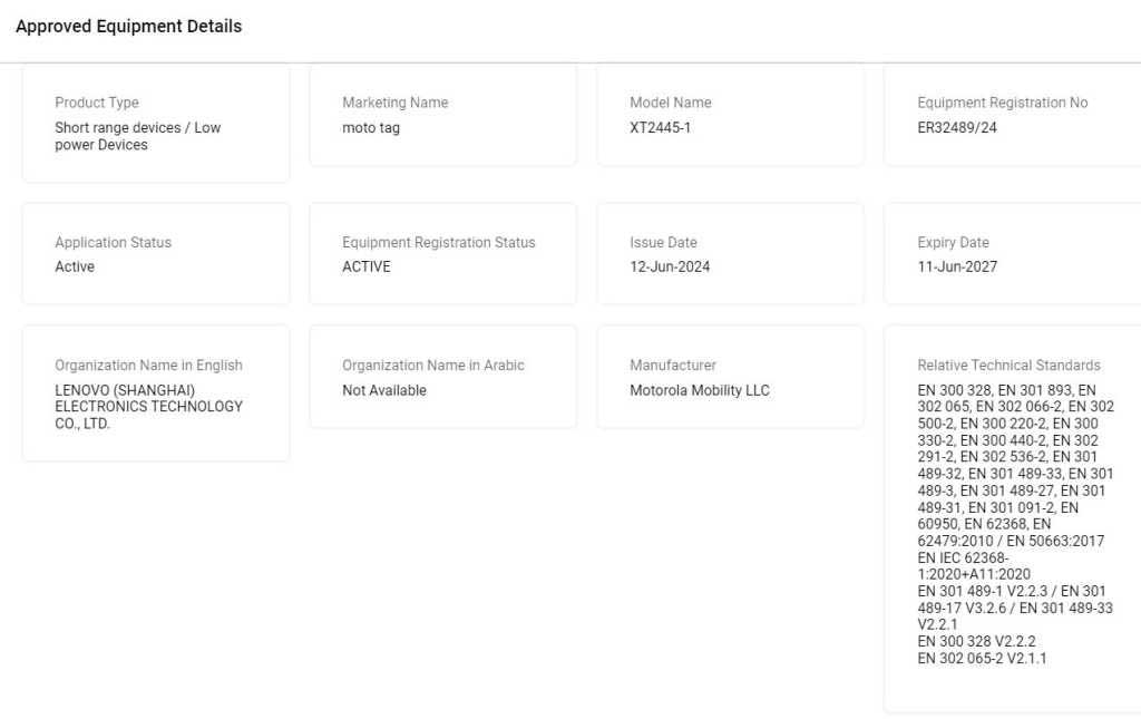 Motorola is the latest manufacturer to make an appearance, though not in an official announcement (via MySmartPrice). The Moto Tag appeared on the UAE’s TDRA certification website with a couple of details regarding the model name and certification date. The “Moto Tag” name is listed as the official product title, though not much else is available in terms of design or operating system.