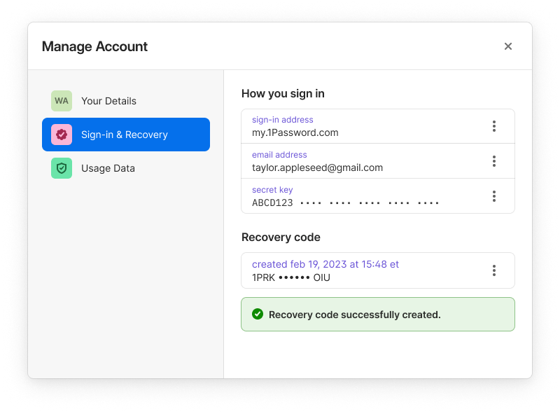 A Recovery code will allow a user to regain access to their account even if they’ve lost their credentials. The code is in your account and should be “stored somewhere safe” once you’ve accessed it. When you use the code, you’ll be prompted to then set up new credentials from scratch and you’ll get a new Secret Key too. The code is reusable, too, but you’ll need to use email verification to finish the process.