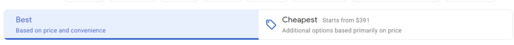 A two-button bar in the search interface for Google Flights has started to appear which prominently shows the choice to sort flights by “Best” or “Cheapest.” It still defaults to “Best,” but the “Cheapest” filter previews the most affordable option.
