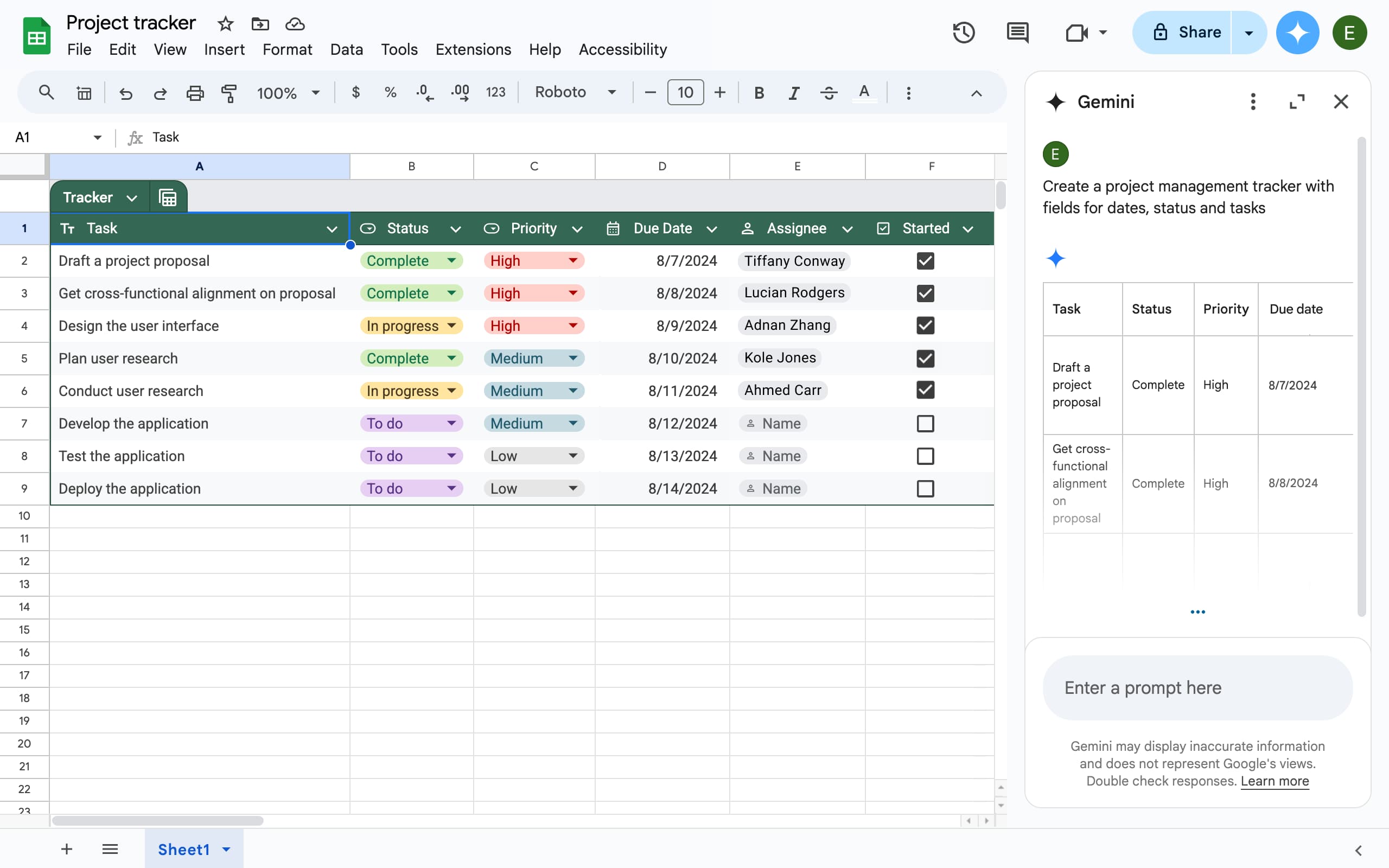 - Sheets: Gemini in Sheets side panel can help you track and organize data. In the side panel, you can quickly create tables, generate formulas and ask how to accomplish certain tasks in Sheets.