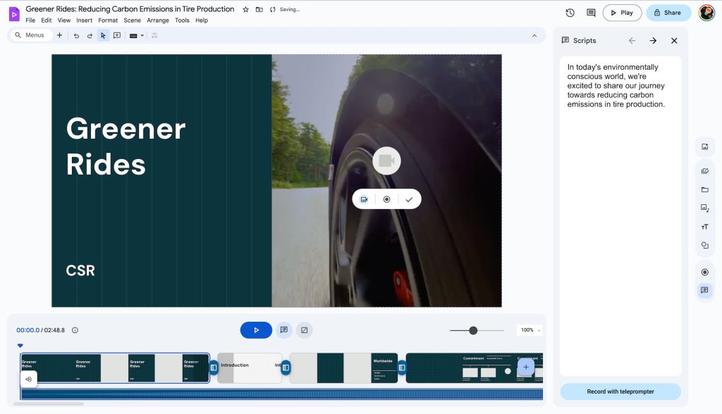 The below video was generated with the following prompt: “Update video about reducing carbon emission from our company’s production lines. We produce tires for motorcycles across the globe.”