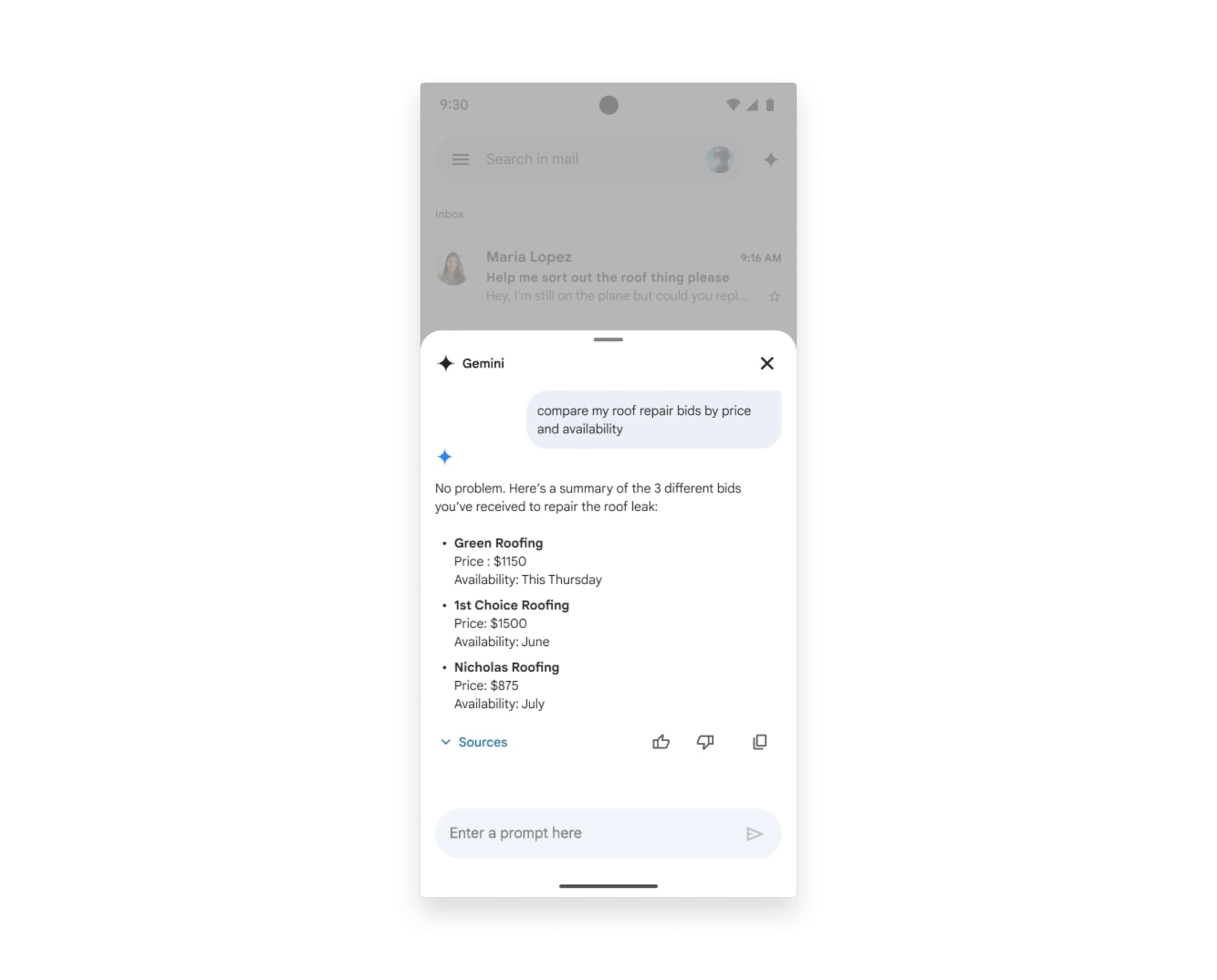 In Gmail for Android and iOS, you’ll find a Gemini button in the top-right corner that lets you bring up the mobile equivalent of a side panel to enter full prompts. Gmail is also getting Contextual Smart Replies that offer more customized, detailed, and nuanced suggestions. This will be rolling out to Workspace Labs in July.