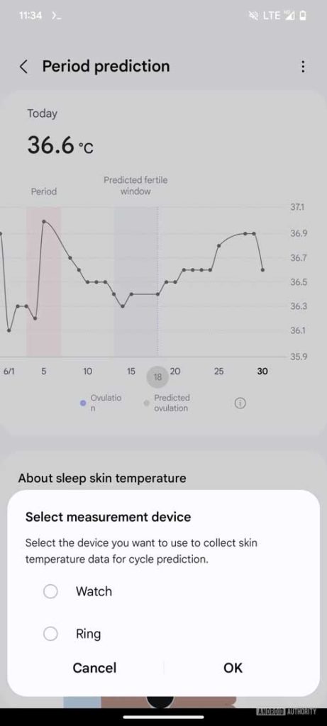 Menstrual tracking is another big function of the Galaxy Ring. The often overlooked feature set is a vital one for a large number of users, and it looks like the Galaxy Ring will be ale to predict aspects of it like ovulation and actual period terms. An interesting thing to note is that the screenshot shows the app asking what device is to be used. It seems as though the Galaxy Ring and Galaxy Watch can’t both be used to combine data in this regard as we once thought.