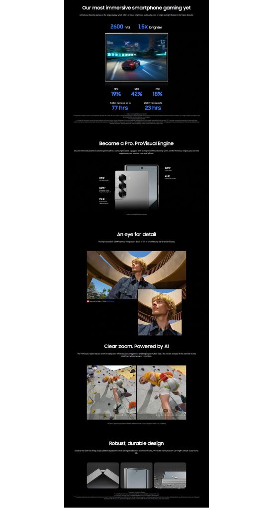 Starting with the Galaxy Z Fold 6, Samsung highlights the lighter weight which measures in at 239g. That’s down from 253g on the Fold 5. The inner display, Samsung says, is 1.5x brighter at 2,600 nits. The cameras are unchanged, but Samsung does discuss improvements made by AI. The materials also note some battery life improvements thanks to the Snapdragon 8 Gen 3 inside. The battery capacity hasn’t gone up. The hardware itself uses aluminum rather than titanium, and the outer display uses Gorilla Glass Victus 2 rather than Armor. That means that the two big upgrades from Galaxy S24 Ultra aren’t making their way to the Fold, despite the rumored price hike.
