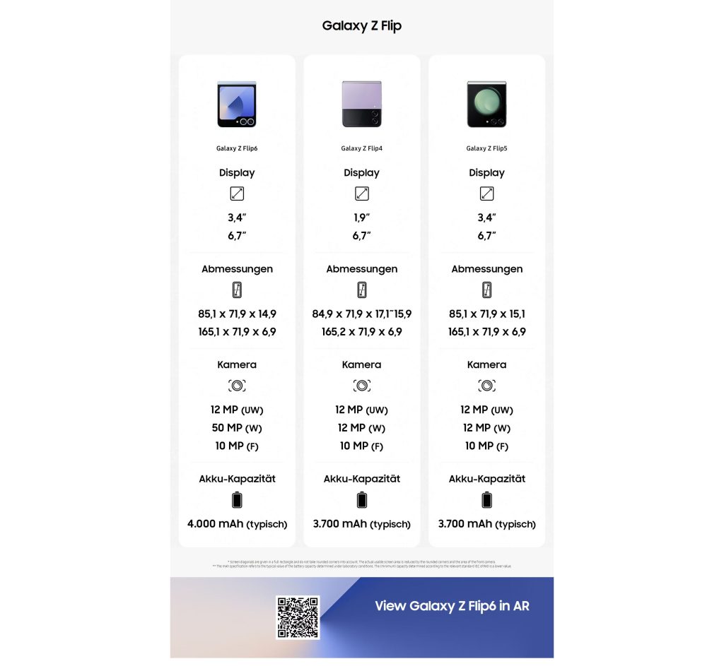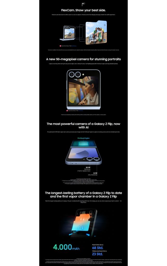Meanwhile, Galaxy Z Flip 6 sees some notable upgrades. It’s also still made from aluminum, but has a 50MP camera as a leak earlier today mentioned. It also picks up a vapor chamber, a first for the Flip series, for better cooling. The battery is bigger, too, at 4,000 mah, up from 3,700 mAh. Despite that, the device is actually 0.2mm thinner than the Flip 5 when closed.