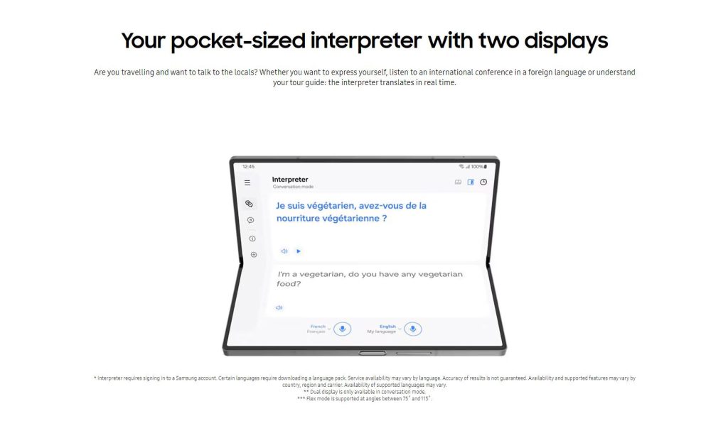 Samsung’s materials and footnotes suggest that this feature only works in Flex Mode (unlike the Pixel’s, which only requires the device to be unfolded) and also specifically says that it only works in “Conversation Mode.”