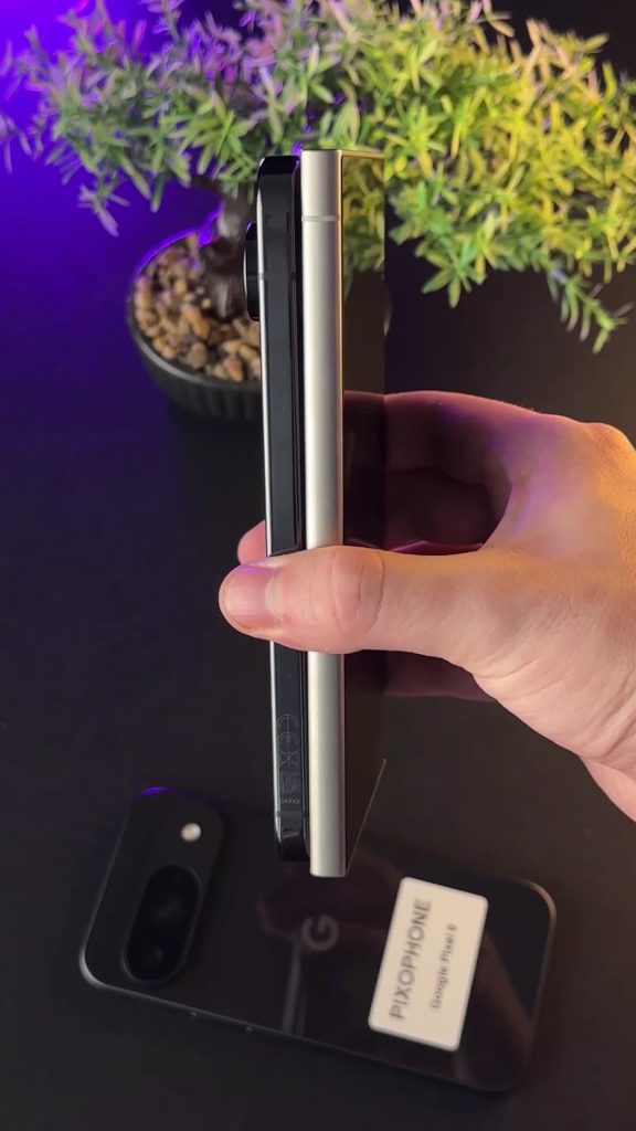 The comparison shows how the smaller Pixel 9 has a glossy rear panel, while the 9 Pro XL opts for a less fingerprint-prone matte finish. However, the flat side rails are reversed between the two models. As such, the Pixel 9 Pro XL has a rather shiny perimeter. The difference is rather obvious and quite unfortunate.