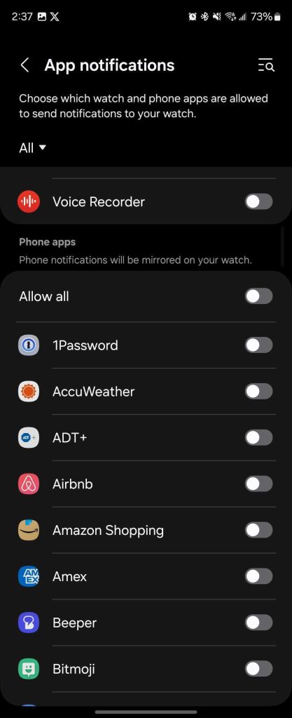 It’s easy enough to change this in the Samsung Galaxy Wearable app (Watch settings > Notifications > App notifications), but the average user might not know to do that right away. And Samsung’s setup process doesn’t make this clear at all (or, if it does, it’s clearly not well spelled out).