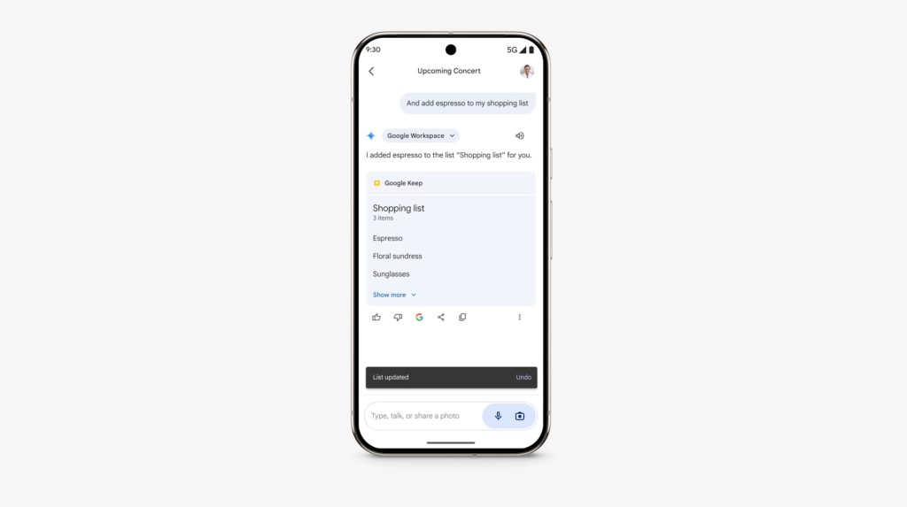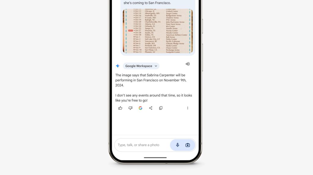In the example below, you use Gemini to take a picture of upcoming concert tour dates and ask: “Check my calendar and see if I’m free when she’s coming to San Francisco.”You then create a reminder in Tasks to check ticket prices later, with the subject remembered, while you can add something to your shopping list in Google Keep in the same conversation.