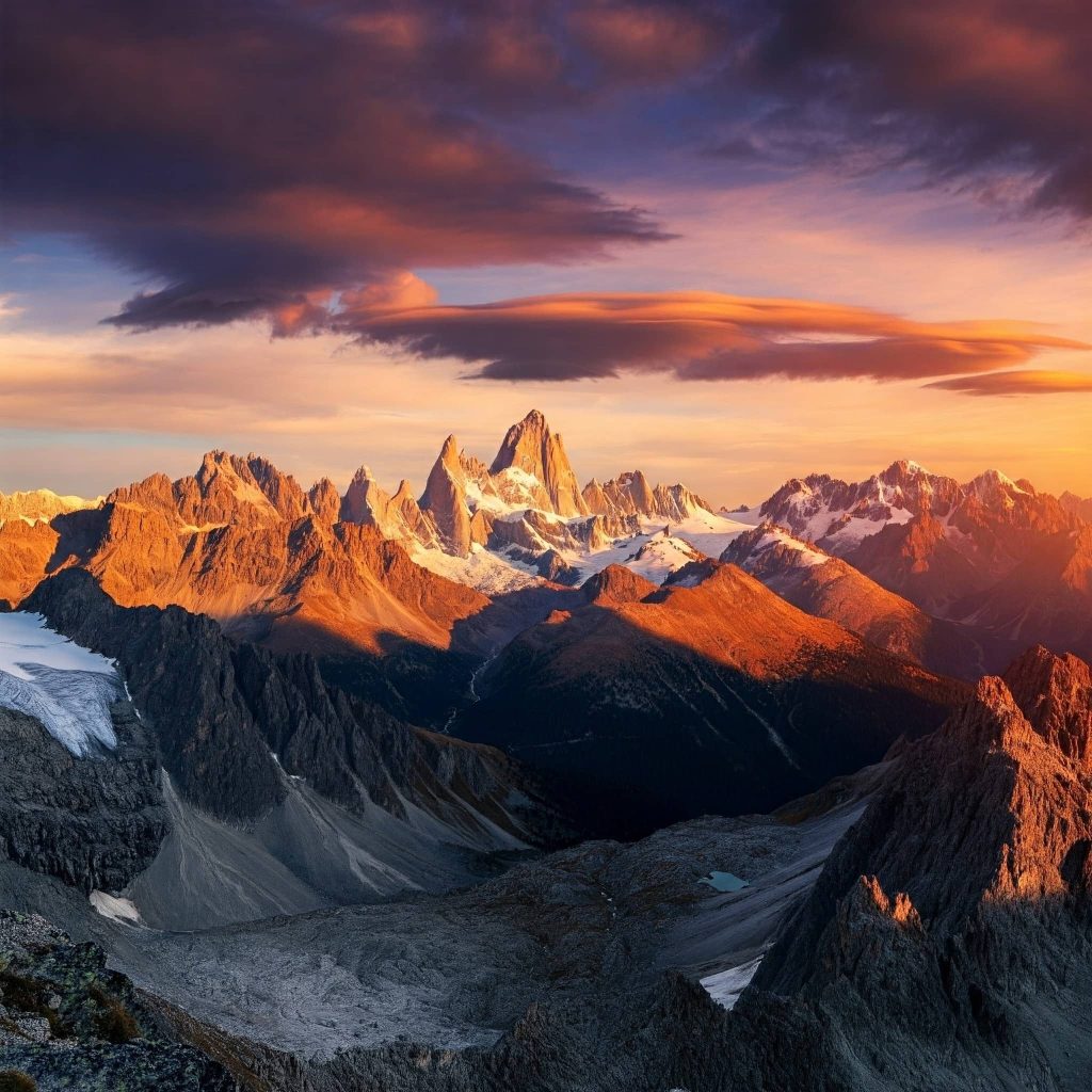- A photorealistic image of a breathtaking mountain vista with jagged peaks and snow-capped summits, bathed in the warm glow of a setting sun. Dramatic clouds, painted in vibrant hues of orange, pink, and purple, streak across the sky…