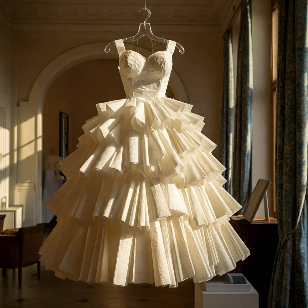 - An image of a ball gown made of paper napkins in an elegant showroom